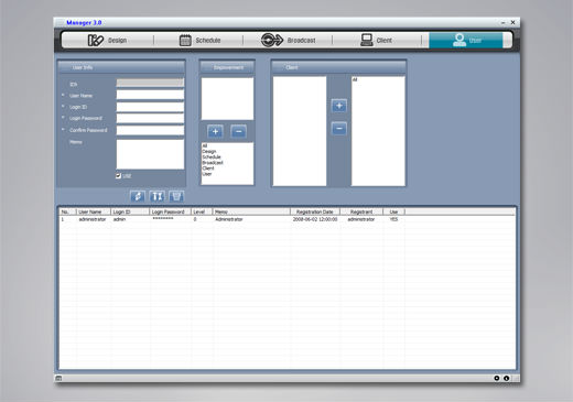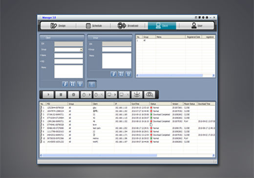 You can add, edit, and delete clients and group by client. You can monitor the activity of client and control it remotely. (Play, stop, reboot, termination)